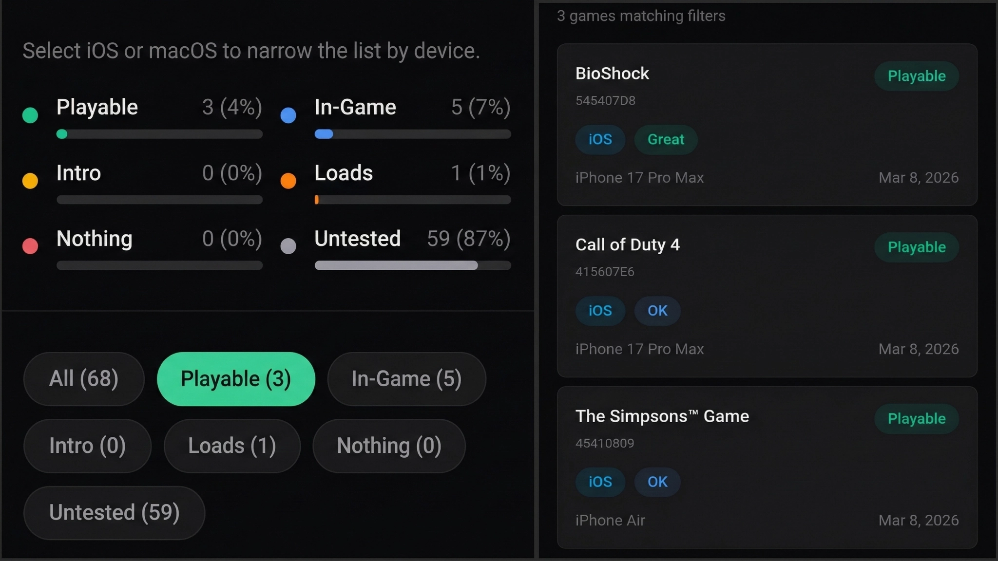 На данный момент протестировано около 13% библиотеки Xbox 360. Полностью играбельны пока только 4% игр, среди которых: BioShock, Call of Duty 4: Modern Warfare и The Simpsons Game.