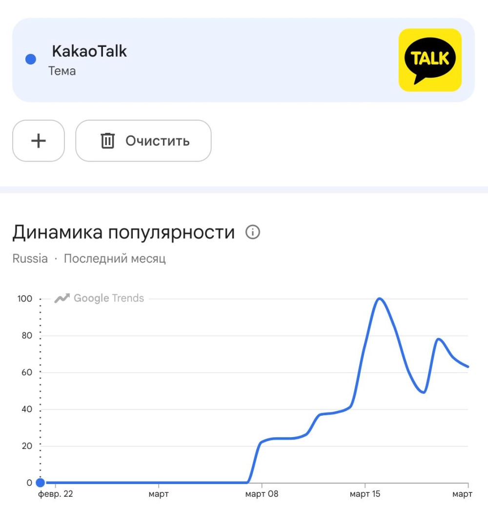 Судя по Google Трендам, за последние несколько недель наблюдается всплеск интереса к приложению. KakaoTalk впервые попал в топ-500 бесплатных приложений во всех категориях в РФ, а пользователи в соцсетях сообщают, что переводят туда родственников и знакомых, не желающих настраивать средства обхода ограничений.