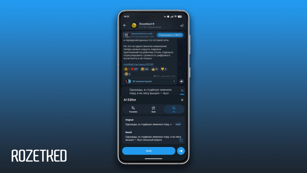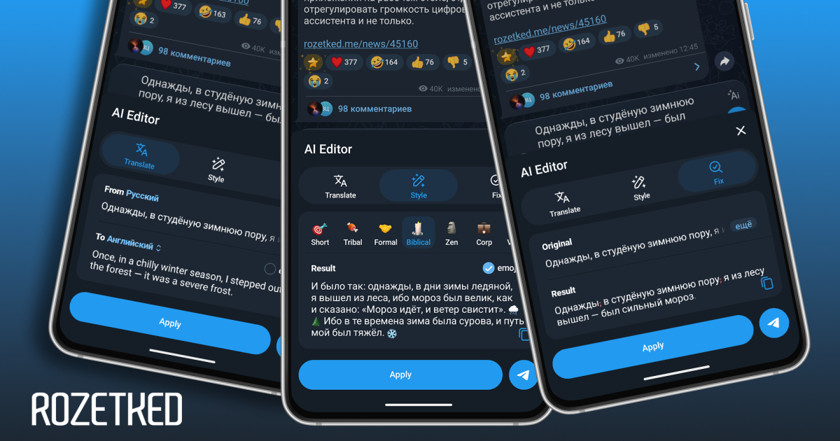Редактор текста на основе ИИ. Для перехода в инструмент нужно набрать как минимум три строки текста, а затем нажать на отобразившуюся кнопку «AI» в правой части поля ввода сообщения. Редактор включает в себя: