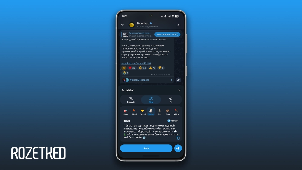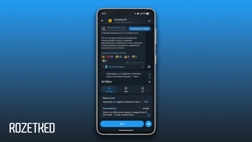 - Опция «Emojify» — автоматически расставляет эмодзи (доступна в режимах перевода и стилизации).