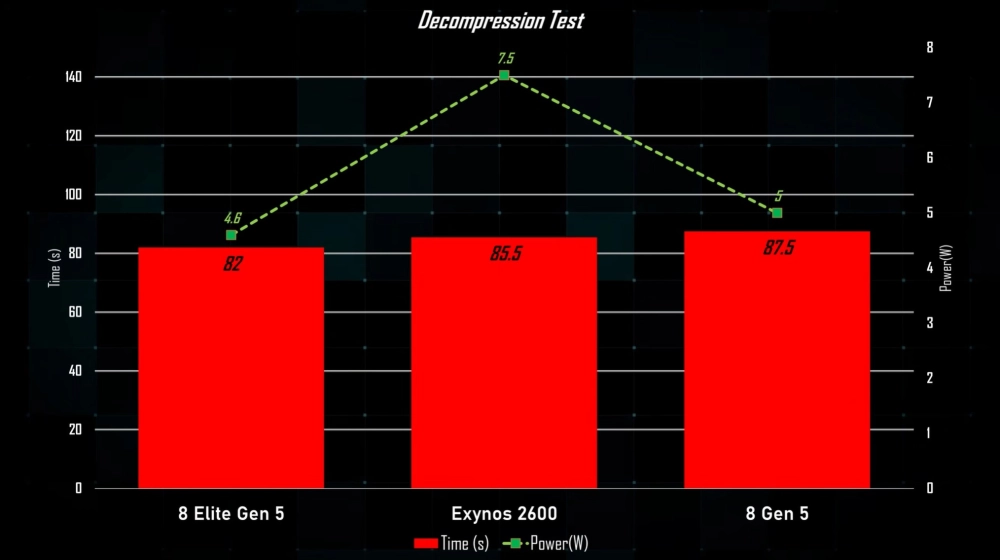 Далее автор провёл тест декомпрессии, в котором результаты оказались похожими: потребление Exynos составило 7,5 Вт, а Snapdragon — менее 5 Вт.