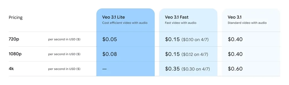 Модель работает с той же скоростью, что и Veo 3.1 Fast, но обходится более чем на 50% дешевле. Veo 3.1 Lite поддерживает форматы Text-to-Video и Image-to-Video, позволяя создавать ролики с горизонтальным соотношением сторон 16:9 и вертикальные 9:16.