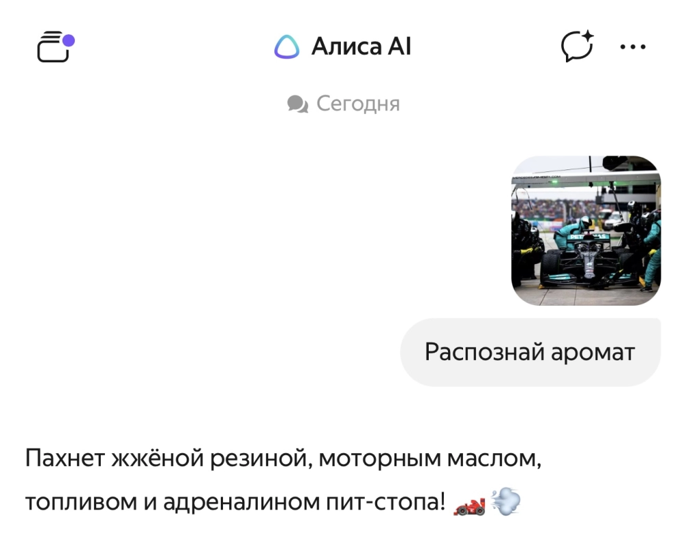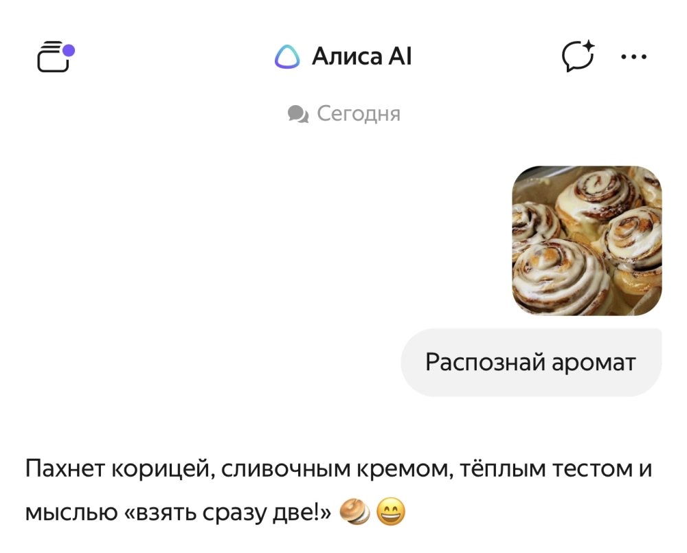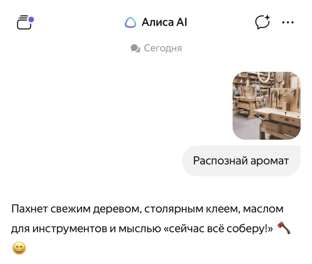 «Нейросеть может описать не только аромат конкретных объектов на фото, но и запах атмосферы. Например, по фотографии с загородным домом „Алиса AI“ напишет: „Пахнет летом, садовыми растениями и бабушкиным пирогом“, а по фото из офиса — „Пахнет кондиционером, бумагой из принтера и мыслью „надежда выжить до обеда!“»— пресс-служба «Яндекса»