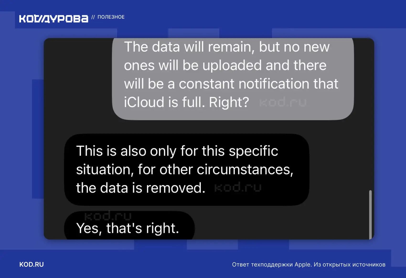 - С одной стороны, «Код Дурова» получил от поддержки Apple подтверждение заявленному на сайте: якобы для пользователей из России сделали исключение, и их данные iCloud+ останутся доступными, но новые файлы загружать в «облако» не получится.