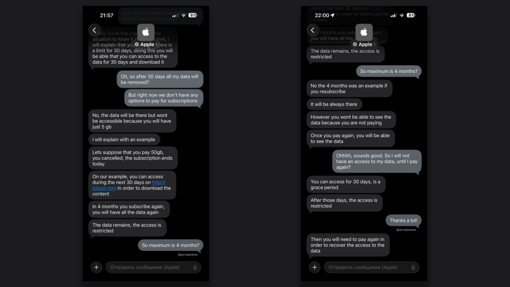 - Однако в сети получают от поддержки Apple и другой ответ: будто данные будут доступны в течение 30 дней после окончания подписки, но потом доступ к ним пропадёт (при этом данные удалять не будут, и доступ к ним можно восстановить, продлив подписку).