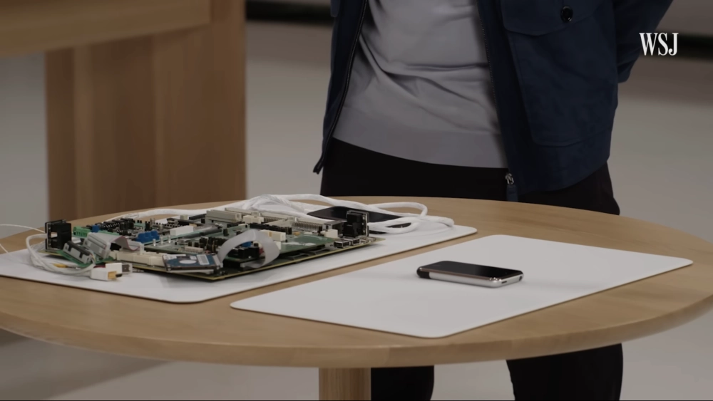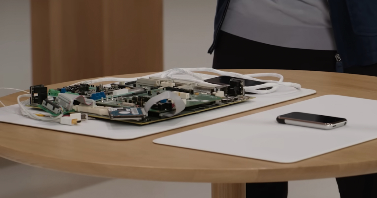 Далее перешли к раннему прототипу оригинального iPhone — он занял целый стол. Дело в том, что этот прототип в первую очередь нужен был, чтобы доказать, что «всё это способно работать». Компоновкой устройства занимались уже на следующих стадиях.