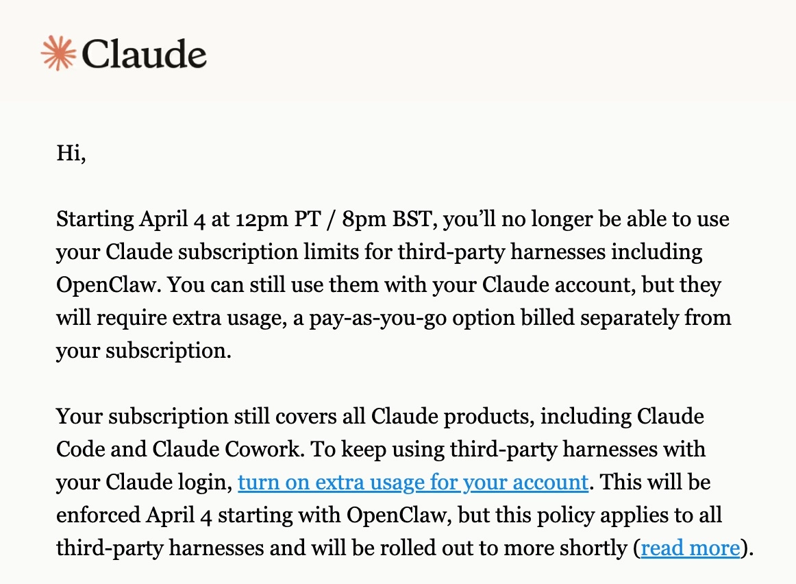 Anthropic объявила, что платные пользователи Claude Pro и Max больше не могут использовать лимиты своих подписок для работы со сторонними ИИ-агентами — в первую очередь речь идёт об OpenClaw. Соответствующее уведомление пользователи Anthropic начали получать 4 апреля.
