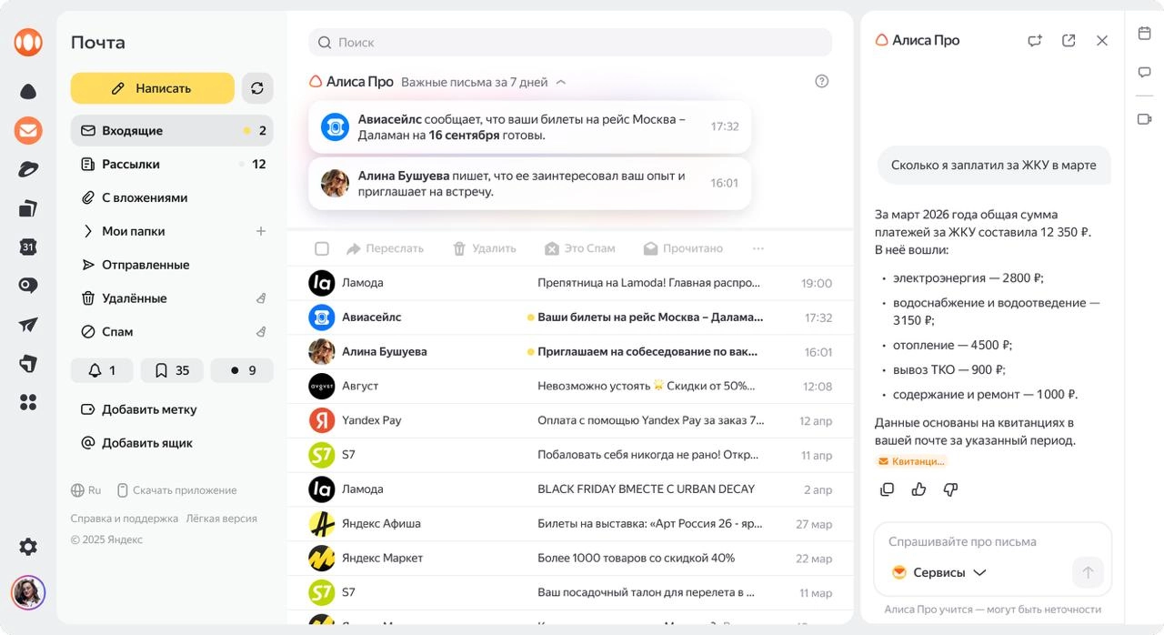 «Наши почтовые ящики — по сути, большой личный или рабочий архив. В них хранятся чеки и счета, билеты на самолёт и на концерты, штрафы, страховки, переписки по проектам, сметы от подрядчиков и многое другое. Сориентироваться в этом массиве данных бывает сложно, и здесь на помощь приходит „Алиса Про“. Она не просто находит письмо или цепочку писем с нужными сведениями, а даёт готовый ответ с фактами прямо в чате»— Никита Анферов, руководитель «Яндекс Почты»