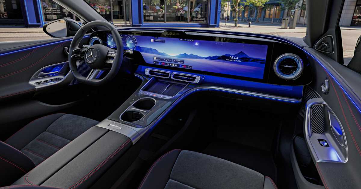 Главная деталь салона — огромный экран MBUX Hyperscreen диагональю 39,1 дюйма, который проходит через всю переднюю панель. Внизу дисплея оставили физические кнопки для управления звуком и климатом.