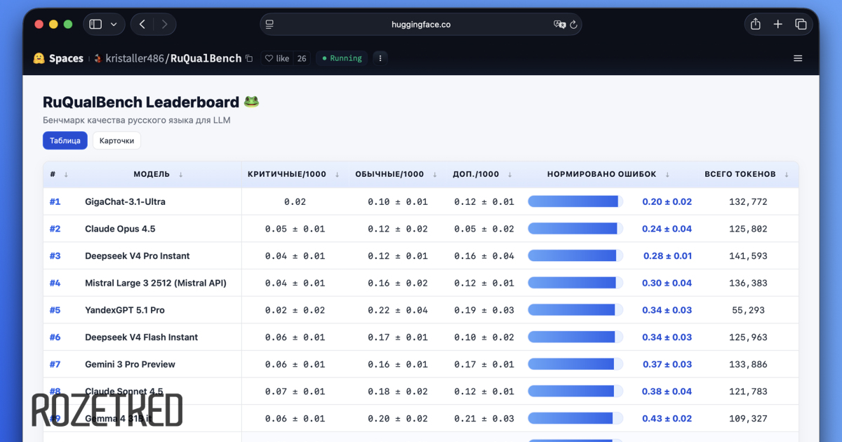 Модель «ГигаЧат Ультра» заняла первое место по качеству генерации текста на русском языке в открытом независимом бенчмарке RuQualBench. По знанию русского языка «ГигаЧат» обошёл признанных международных лидеров: Claude Opus 4.5 (Anthropic), Deepseek V4 Pro, GPT-5, Gemini 3 Pro и другие модели.