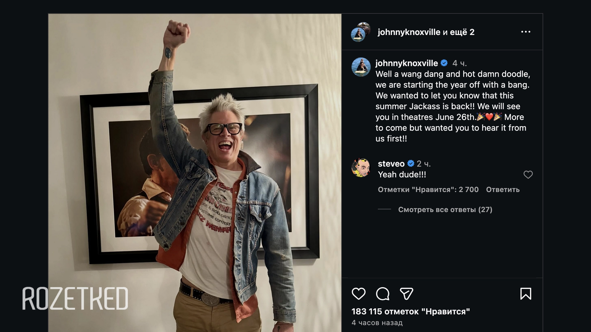 «Чудаки» вернутся с пятым фильмом — анонсом в соцсетях поделился сам Джонни Ноксвилл. Подробностей о проекте нет, но известна дата выхода — 26 июня.
