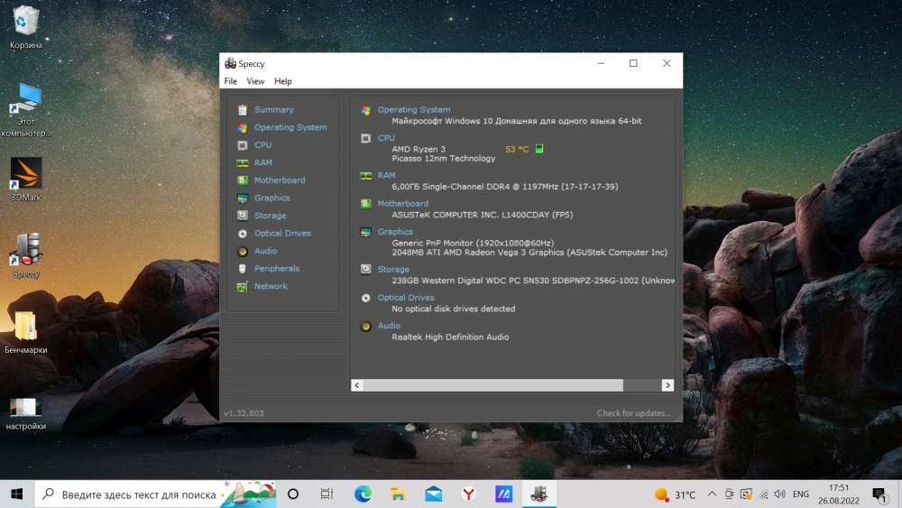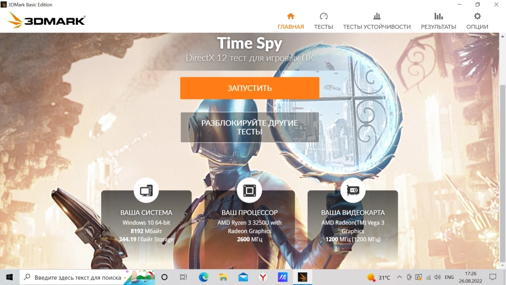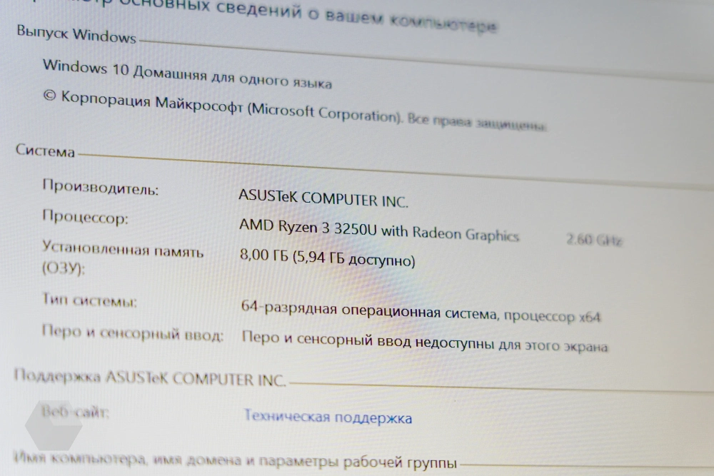 - Процессор: AMD Ryzen 3 3250U, 2 ядра, 4 потока, частота до 3,5 ГГц