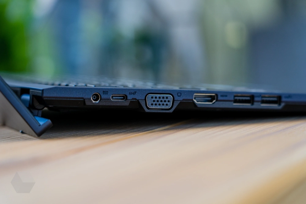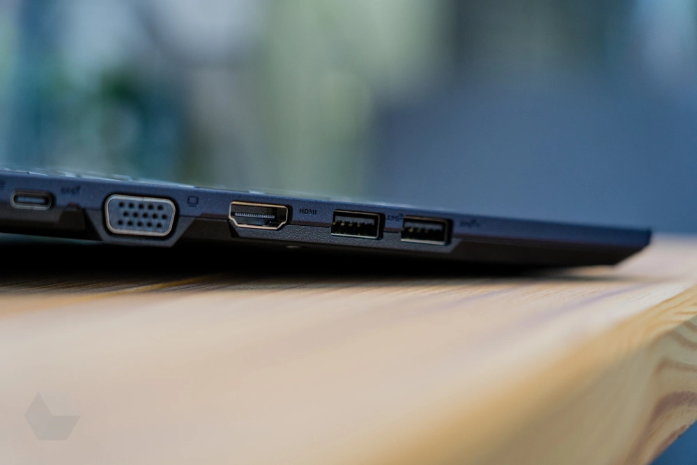 Если говорить про техническое оснащение ноутбука, то тут есть всё, что потребуется в работе. Слева тебе и HDMI, и два USB-A, и один USB Type-C, и проприетарный разъём зарядки, и даже VGA-порт для вывода картинки на какой-нибудь проектор.