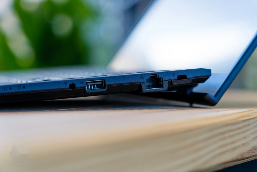 С другой же стороны разместилось чуть поменьше портов. Но можно отметить ещё один USB-A и разъём для подключения проводного интернет-кабеля (RJ-45).