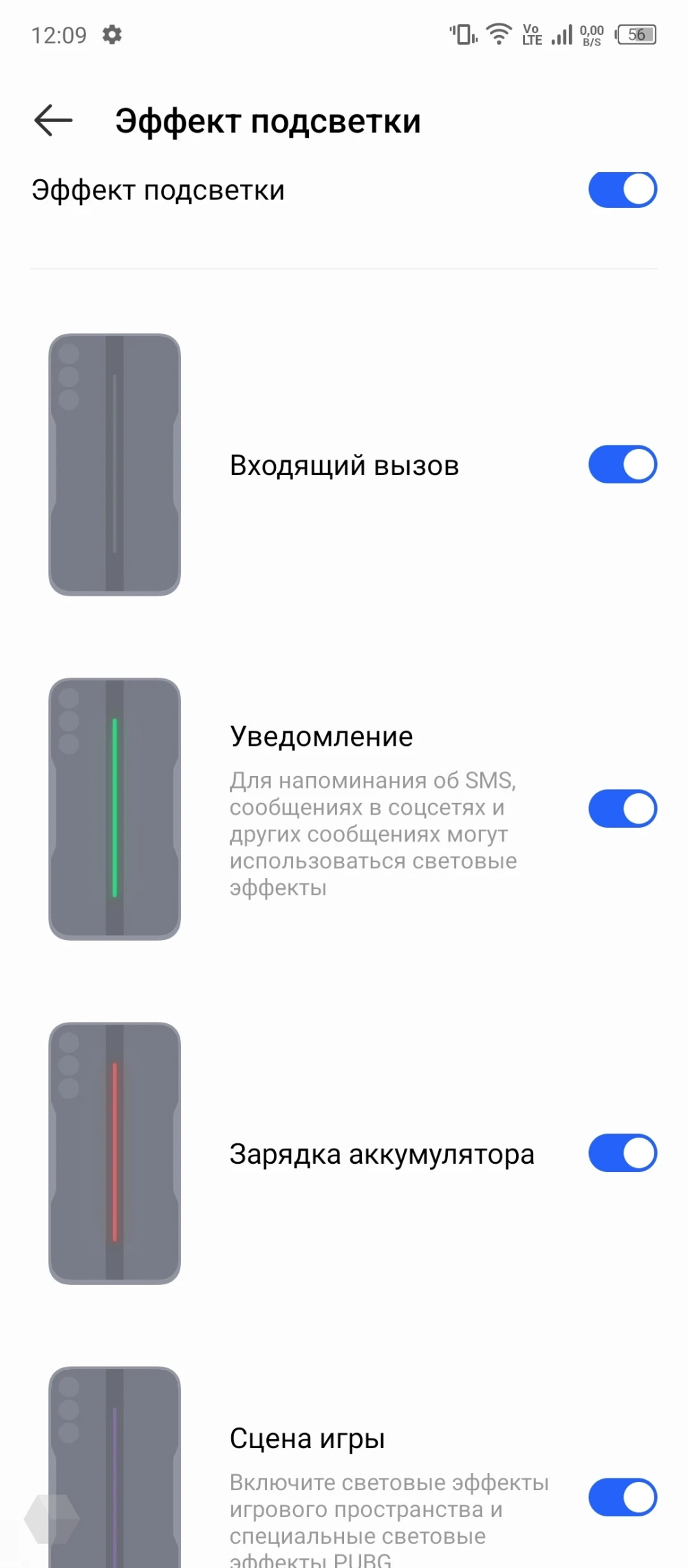 Фишка с подсветкой ограничена по своим возможностям. В настройках нельзя выбрать цвета для отдельных активностей, вместо этого дают просто активировать тумблером подсветку при звонках, зарядке, уведомлениях, игре в PUBG.