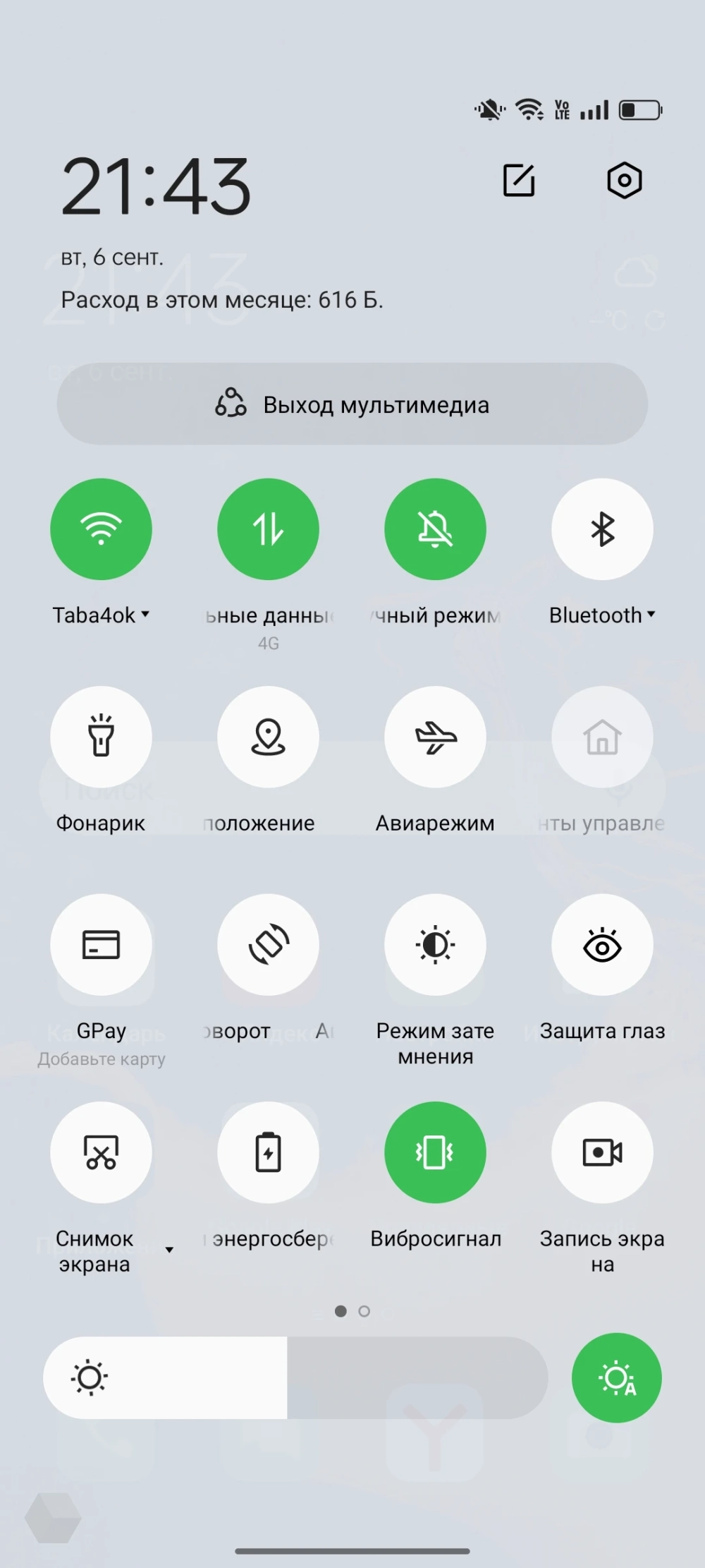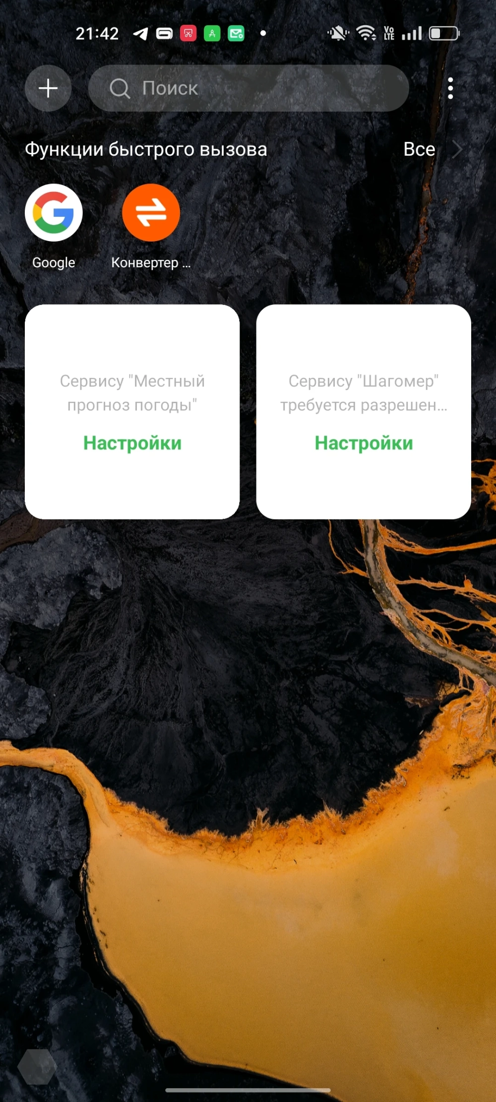 В оболочке нет меню приложений, поэтому все программы распределены по рабочим столам. Левый является главным, ещё левее — экран с умными виджетами. Свайп вниз по центру экрана открывает поиск, а если потянуть пальцем от самого верха, то попадаем в меню уведомлений и быстрых настроек. И нет никакой разницы, провели вы по левой или правой части экрана, попадёте в одно и то же меню.