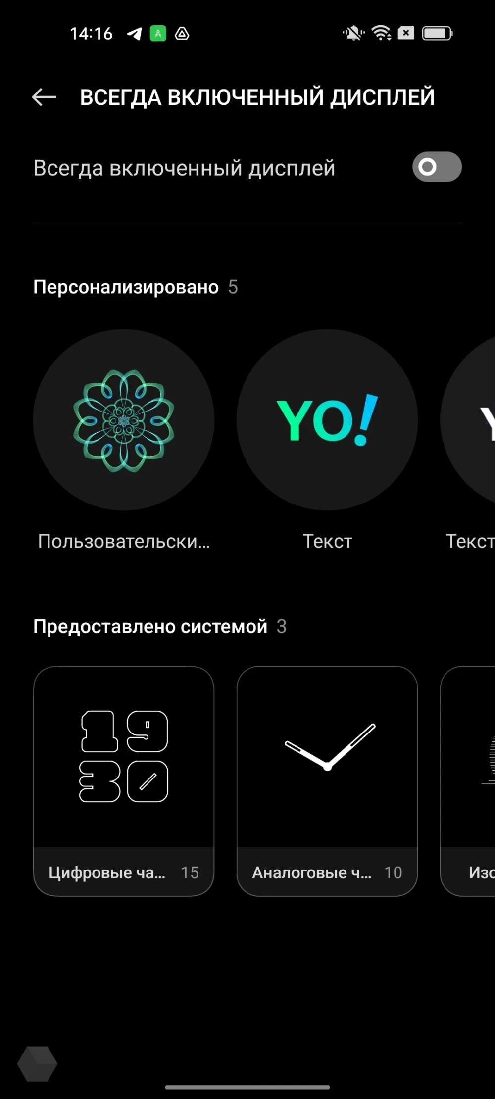 В настройках персонализации есть меню всегда включенного дисплея. AMOLED-матрица умеет задействовать только некоторые пиксели, оставляя все остальные выключенными. Поэтому смартфон в заблокированном режиме на постоянной основе может показывать наличие уведомлений, время и статус заряда батареи.