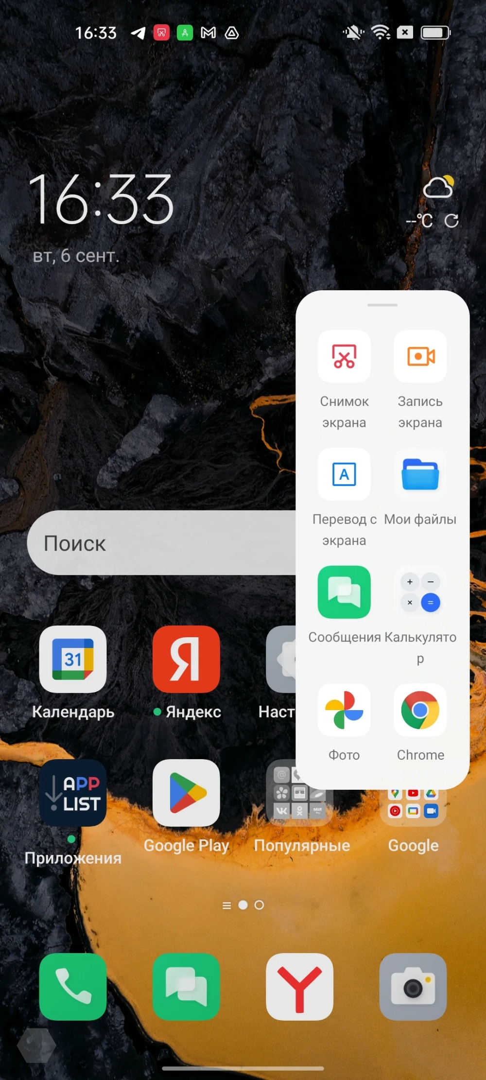 В правой части экрана всегда находится маленькая серая полоса, тянем за неё влево — и открывается смарт-панель с избранными инструментами (скриншот, запись видео, диктофон) и приложениями, которые вы добавляете сюда сами. В настройках её можно отключить.