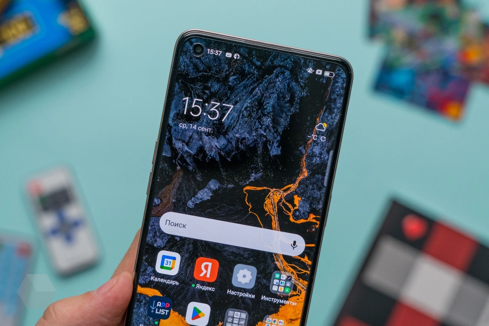 Имеет диагональ 6,43 дюйма и занимает 90,8% передней панели. Рамки по бокам и сверху воспринимаются одинаково, а вот снизу небольшой подбородок. Но главное тут не это, а AMOLED-матрица с настоящим чёрным цветом и разрешением 2400×1080 точек, что даёт плотность пикселей 409 PPI. Это значит, что даже мелкие шрифты выглядят чёткими, отдельных пикселей нигде не видно, глаза меньше устают.