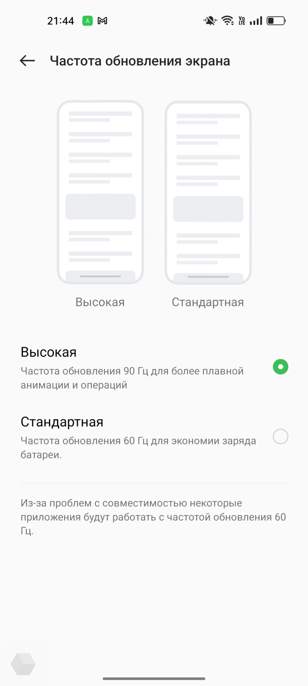 Ещё одна фишка экрана — 90 Гц. Активируется просто в настройках и делает пролистывания списка писем, чатов, страниц в браузере плавнее. Лично у меня при отключении высокой частоты обновления экрана появляется рябь в глазах. Проверил, работает в Gmail, Telegram, Chrome, Google Play, системных настройках, из чего делаю вывод, что это не просто фишка для внутреннего интерфейса, она работает с сторонним софтом.