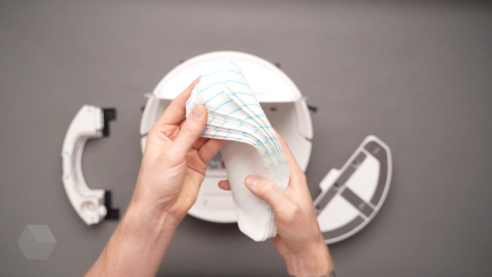 В комплекте с роботом нам достался картридж для влажной уборки и десять сменных тряпочек, картридж фильтрации воздуха с одним сменным ароматическим блоком, большая док-станция, которая и отличает версию T9+ от T9, мешок для мусора, провод зарядки и макулатура.
