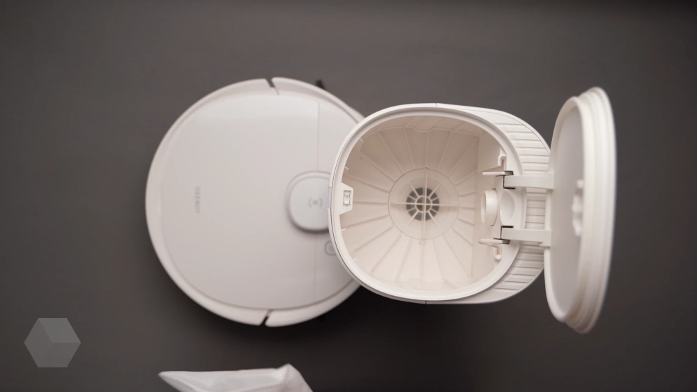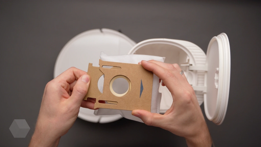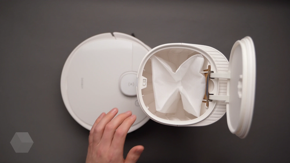 Док-станция крупная, такую не спрячешь под высоким комодом. Но зато в ней есть свой пылесборник на 2,5 кг и мотор, который откачивает мусор из робота. Элементов управления нет, максимум можно открыть крышку и поменять мешок для мусора.