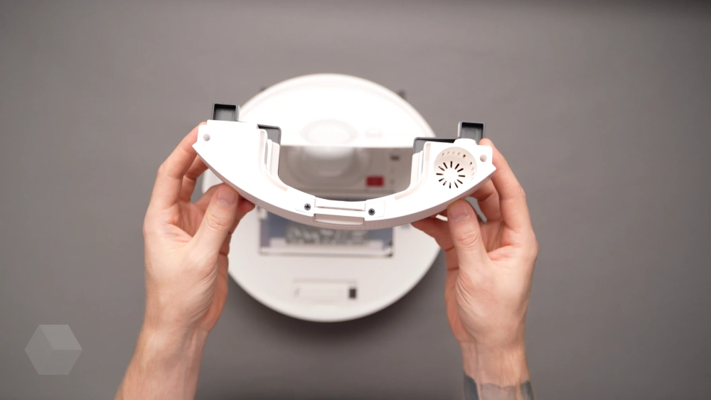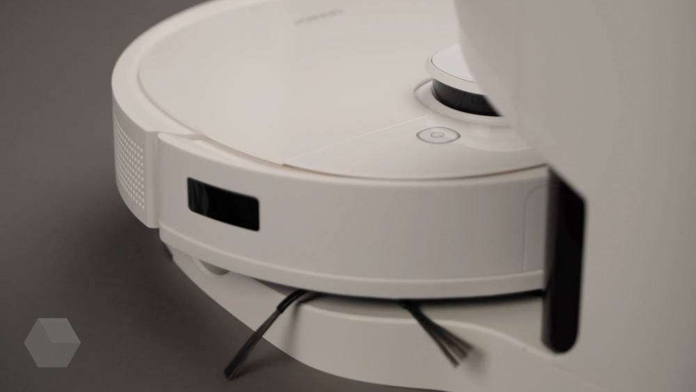 Ближе к нижней части находятся два отверстия для вывода мусора в док-станцию, но об этом позже. По периметру целая россыпь датчиков, которая помогает заметить мелкие предметы, которые не видят остальные датчики. Есть и сенсор высоты. Робот определяет перепады высот и не полезет с лестницы или не поползёт на ковёр при влажной уборке.