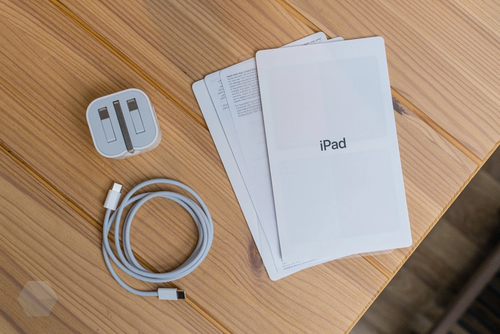 О комплектации сказать особо нечего, она стандартная для iPad. В белой коробке лежит сам iPad, документация, зарядный кабель USB-C—USB-C и 20-ваттный адаптер питания. Ничего примечательного, не считая того, что iPad не влияет на экологию — адаптер не убрали. Это только iPhone окружающую среду загрязняют.