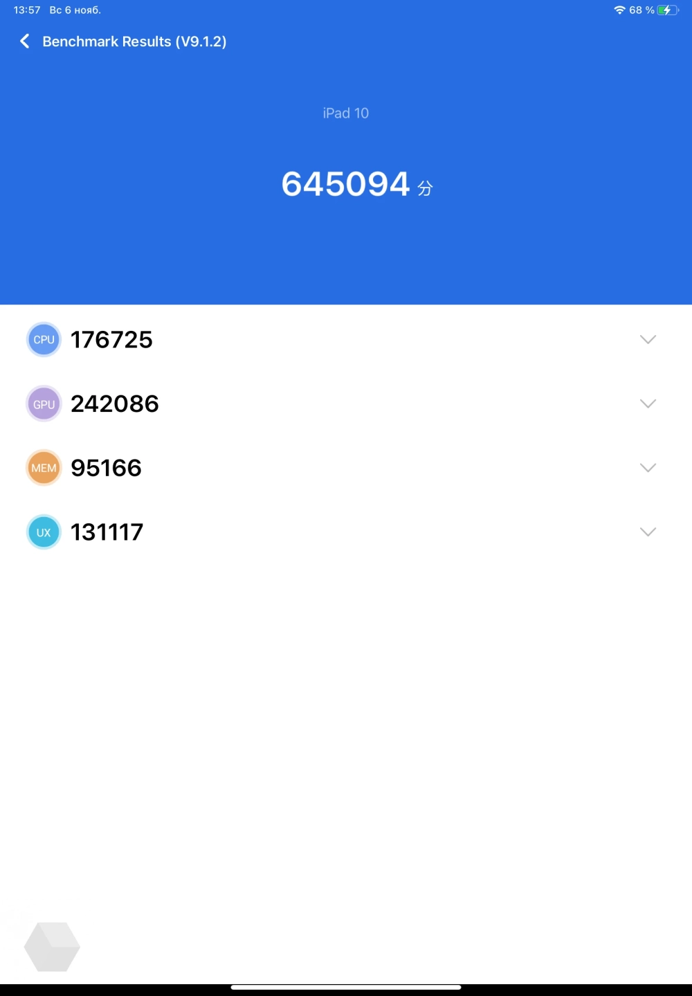 Обновили чип и добавили гигабайт оперативной памяти — A14 Bionic и 4 ГБ ОЗУ против A13 Bionic и 3 ГБ ОЗУ. Заметно ли это? Не особо. Я и с iPad 9 не испытывал никаких проблем, кроме нагрева во время игры. Здесь, по личным ощущениям, всё то же самое. Результаты синтетических тестов прилагаю.