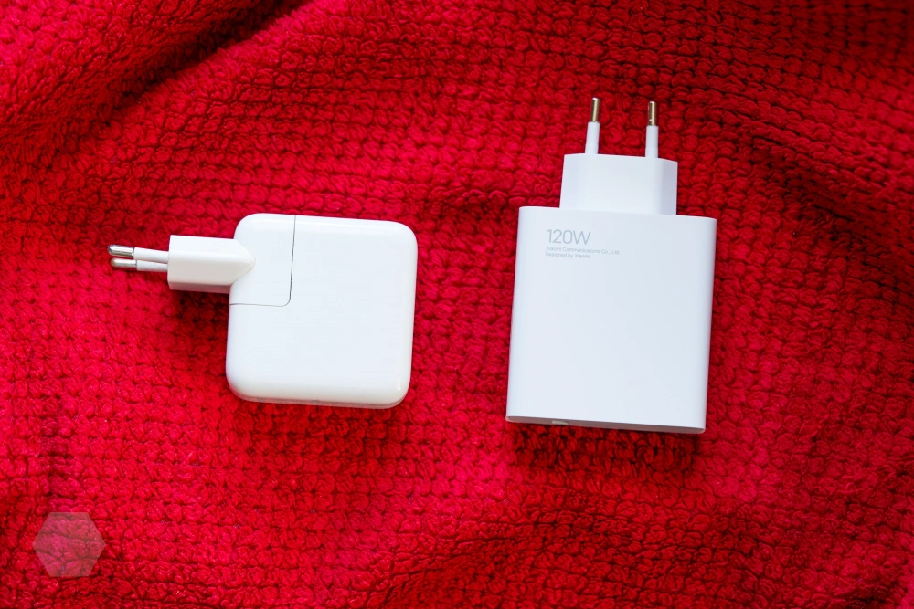 Заряжается смартфон своеобразно: ему дано в комплект мощнейшее зарядное устройство на 120 Вт, которое мощнее даже, чем у большинства ноутбуков. Для сравнения, на фото адаптер для MacBook Air на 35 Вт, оцените размеры:
