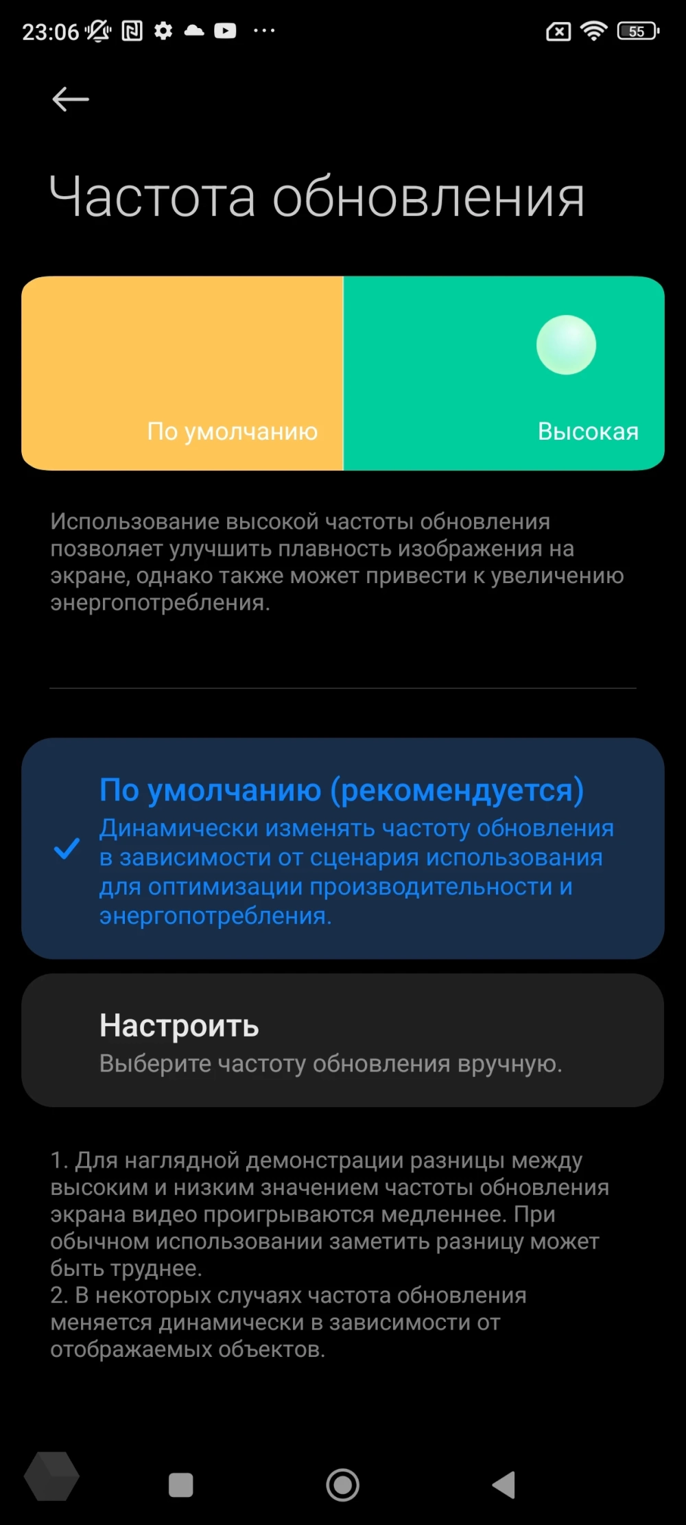 Экран здесь действительно достойный. Это матрица AMOLED с диагональю 6,67 дюйма и разрешением 1220×2712. Соотношение сторон — 20:9, плотность точек — 446 ppi. Поддерживается частота обновления 120 Гц, но есть и автонастройка, где частота динамически подстраивается под сценарий использования. Такой вариант, как минимум, экономичнее в плане энергопотребления.