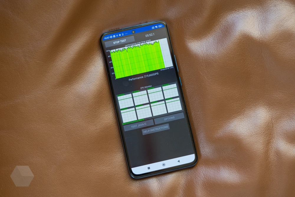 Платформа мощная, очень высокого уровня, выдаёт в бенчмарках результаты, сопоставимые с результатами флагманских Qualcomm Snapdragon 888/888+. Для смартфона такого ценового уровня платформа выбрана добротная: к плавности и быстродействию никаких претензий, с играми тоже нет проблем, даже с самыми требовательными. К тому же, используется продвинутая жидкостная система охлаждения с увеличенной испарительной камерой, поэтому нагрев при нагрузках не превышает уровня, типичного для такого рода устройств.