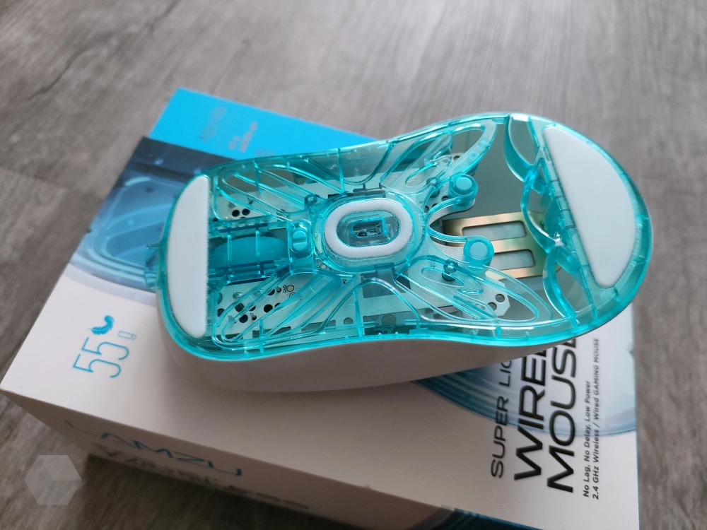 Весит девайс 55 г. Первая мысль после того, как я взял мышь в руки: «ничего себе, вроде в обзорах говорили, что у неё встроенный аккумулятор, обманули что ли». Мышка настолько лёгкая, и кажется, что внутри нет элемента питания, и сюда надо ставить свои батарейки. Но нет, внутри всё есть, просто после моей Oklick 985G, которая весит 120 г, продукт от LAMZU — это какая-то пушинка.