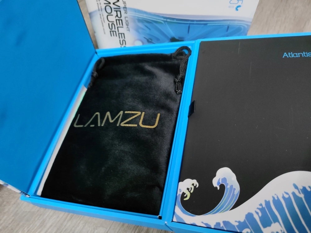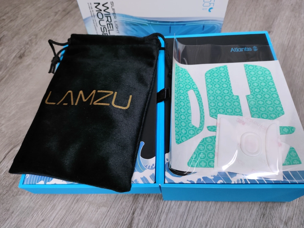 Начинать рассказывать про LAMZU Atlantis стоит с комплекта поставки, и не потому что это добрая традиция всех обзоров. Просто комплект тут является одним из плюсов. Устройство поставляется в красивой коробочке в виде книжки. Внутри лежит мешочек с мягким проводом, дополнительным комплектом ножек (первый комплект из белого тефлона уже на мышке) и накладками на кнопки и боковины грызуна. Также есть передатчик и переходник.