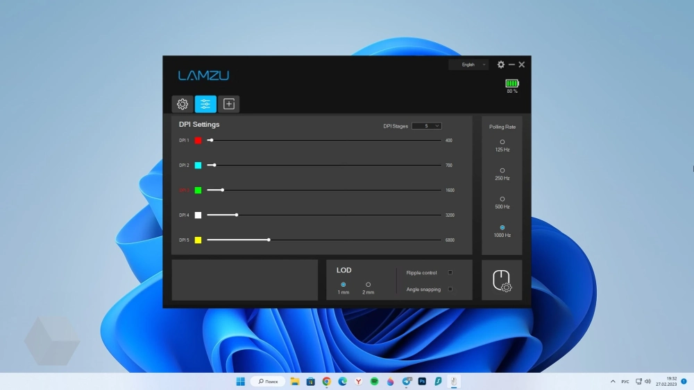 Можно и вручную настроить задержку клика и чувствительность для каждого из режимов dpi, а также задать частоту опроса (от 125 до 1000 Гц) и значение LOD (1/2 мм). Для справки, LOD (lift off distance) — это высота отрыва, на которой сенсор прекращает отслеживать поверхность и срабатывать.