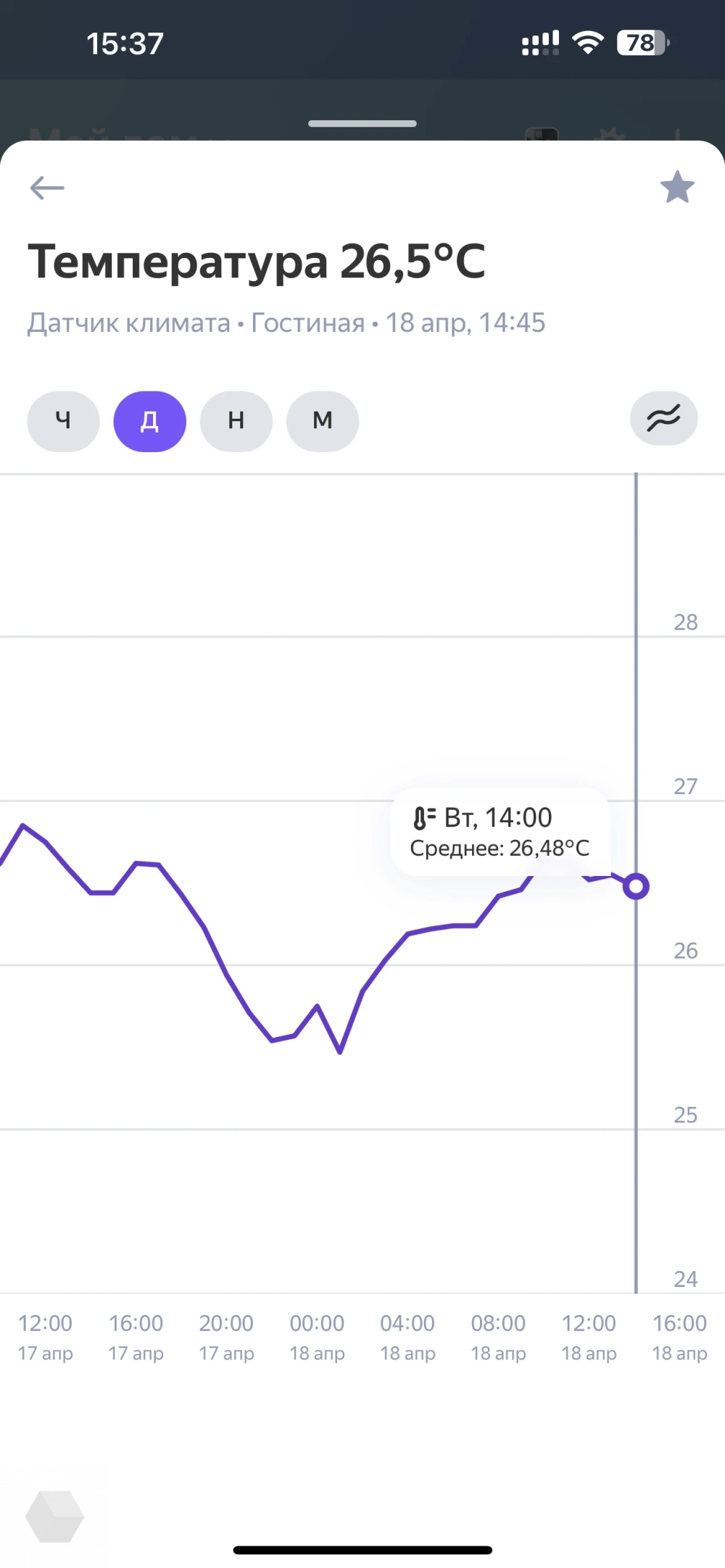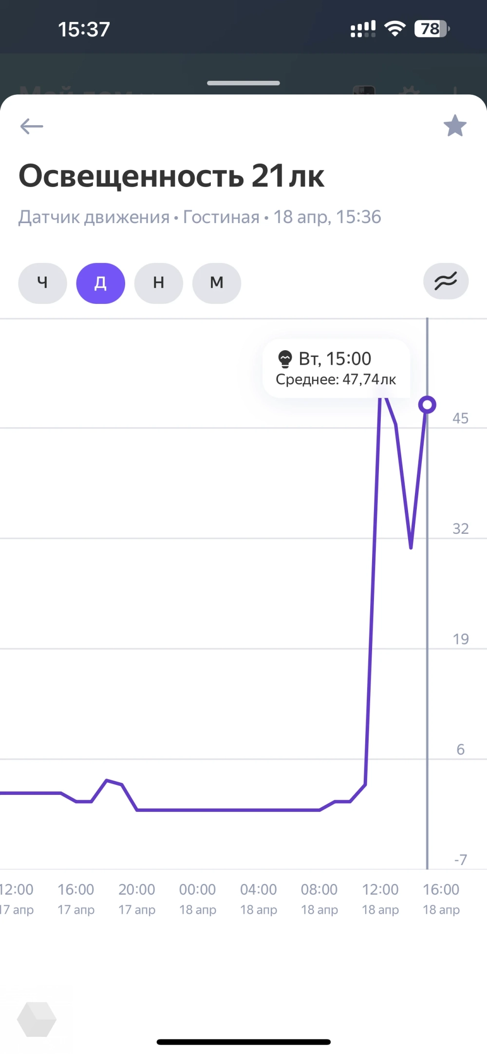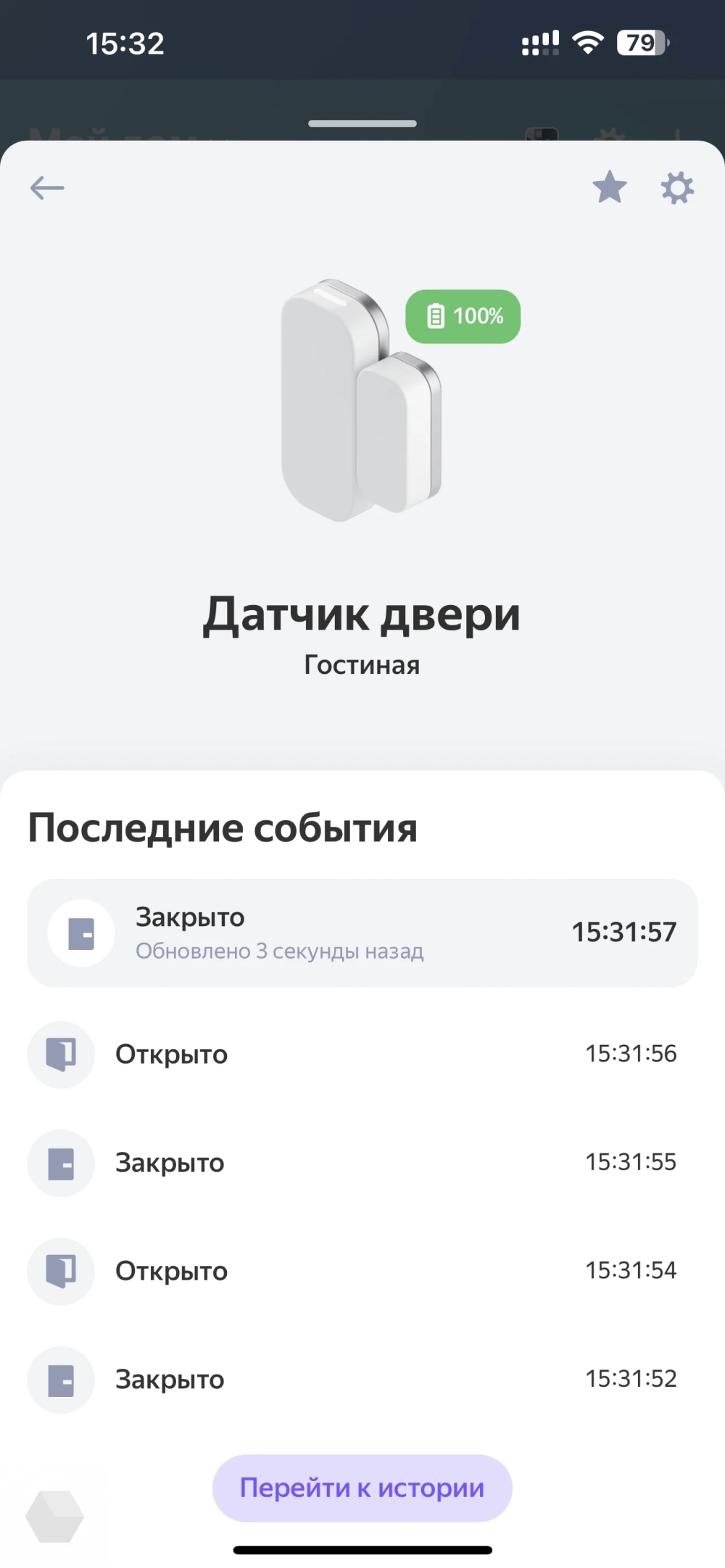 По форме похож на кнопку, только меньше — белый квадратик. Это единственный датчик из линейки, который будет полезен без сценариев и на повседневке. В приложении собраны данные и красивые графики по всем параметрам: