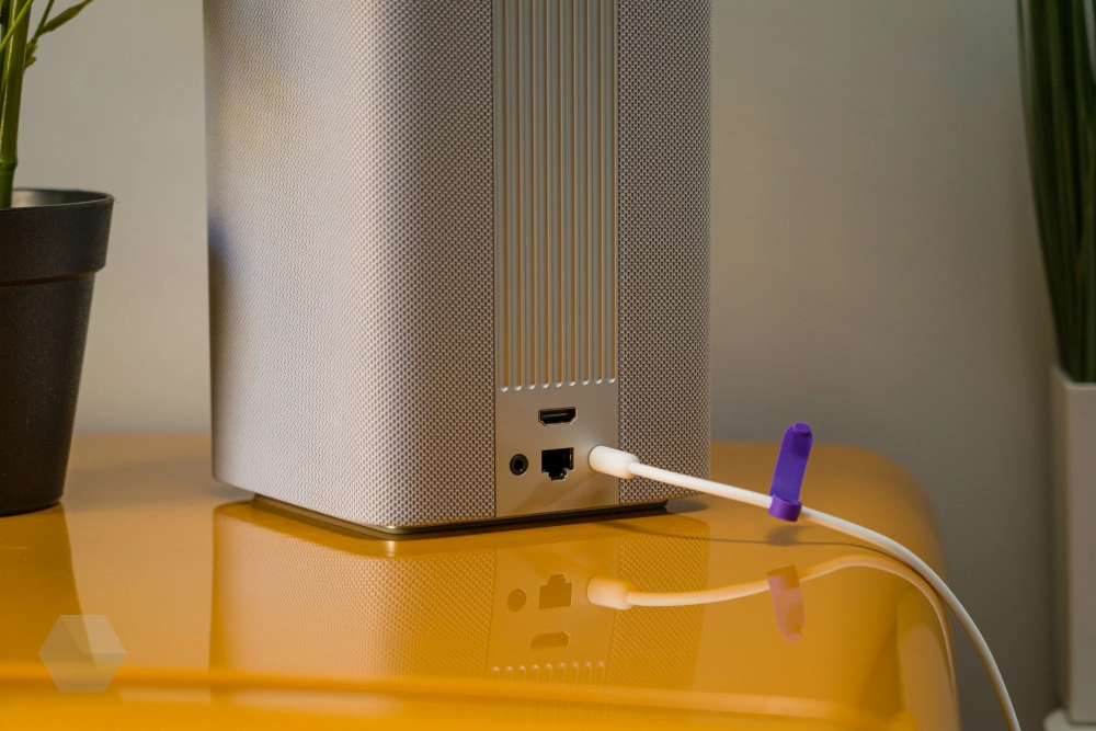В комплекте: колонка, адаптер питания, пульт, кабели HDMI и Ethernet, инструкции и наклейки.