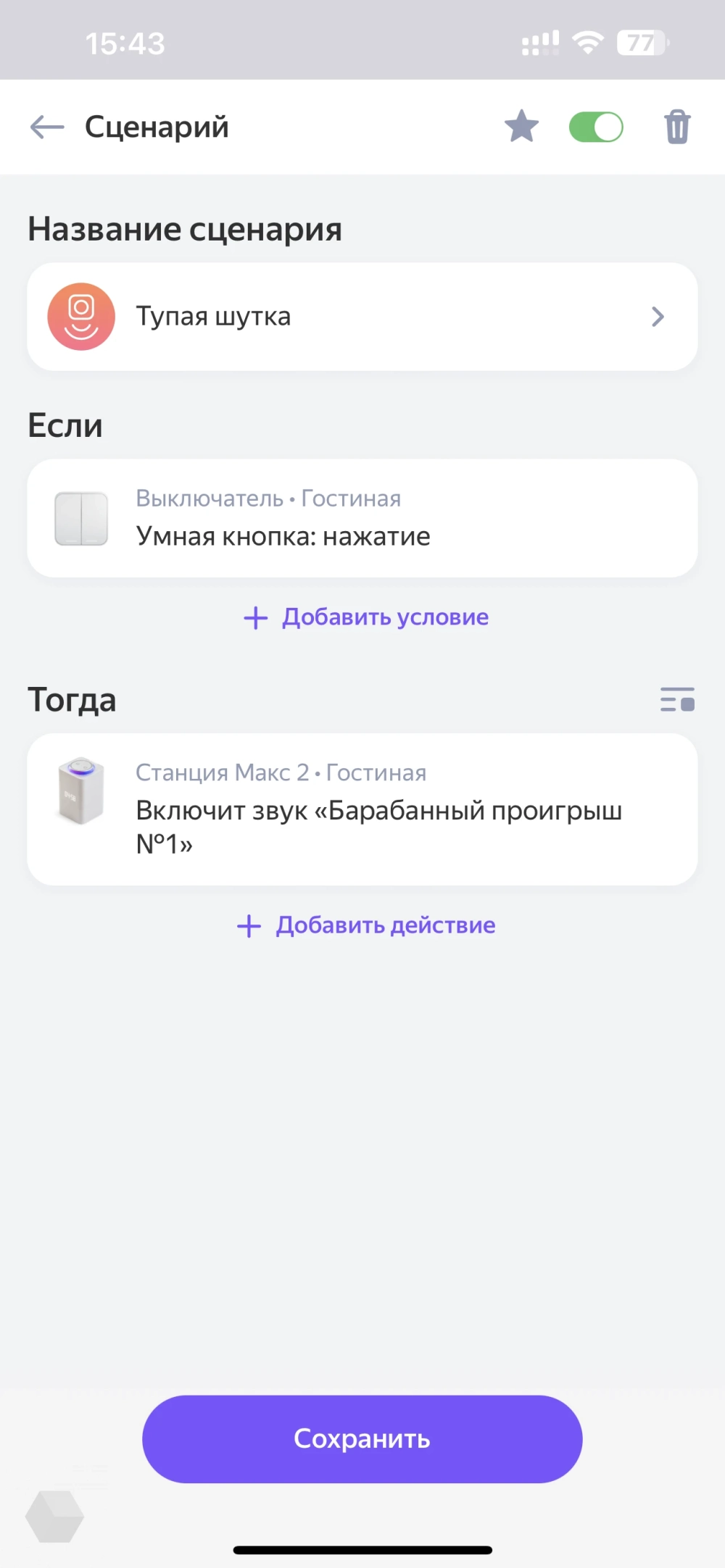 Или опять же — сигнализация. Если пришло уведомление, значит, кто-то открыл дверь. Причём сценариев можно насоздавать сколько угодно и включить/отключать по актуальности. Короче, снова вопрос фантазии.