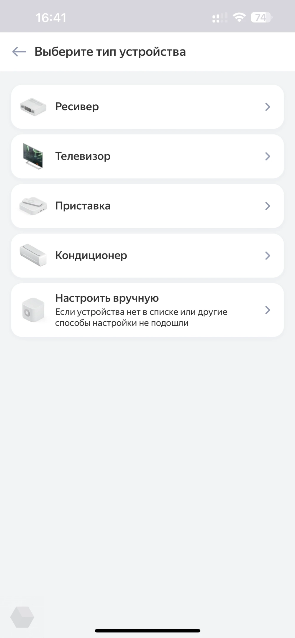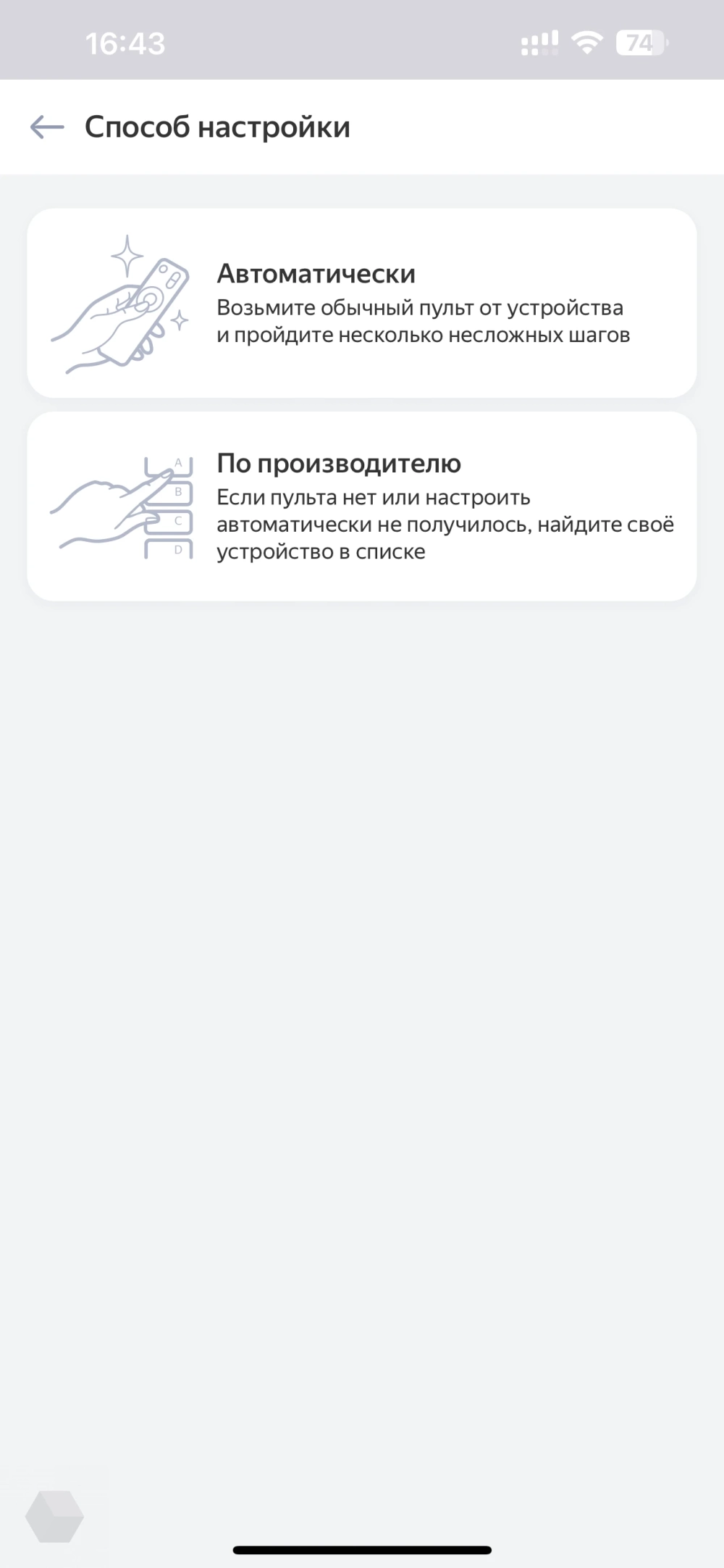 К хабу можно подключить два типа устройств: Zigbee и инфракрасные устройства, то есть телевизоры, кондиционеры и другую технику с ИК-пультами. Я добавлю телевизор LG C1. Это можно сделать автоматически, выбрав из списка преднастроенные пульты, или вручную, запрограммировав кнопки самостоятельно. Нужно просто следовать инструкции — смотрите скриншоты: