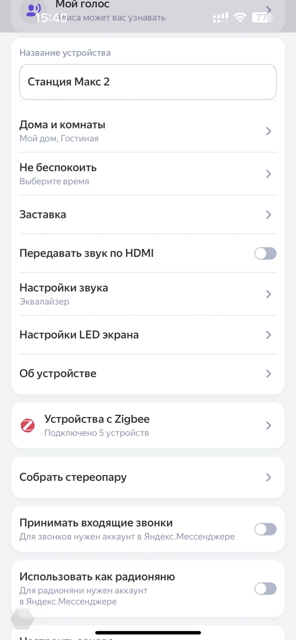 Zigbee — протокол, который позволяет устройствам и датчикам умного дома общаться между собой. В идеале это должно было бы означать, что Станция Макс может локально выполнять действия и сценарии даже без интернета, например, включить свет или сообщить температуру в доме. Но на деле это не так.