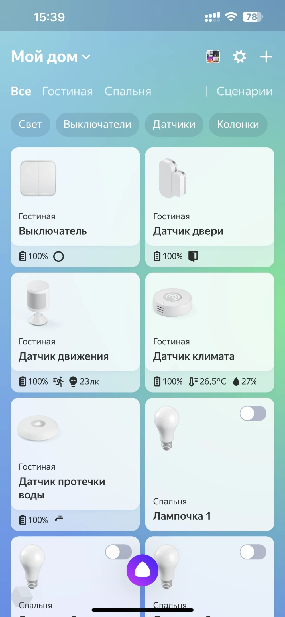 - Создавать сценарии с датчиками. Например, включение кондицинера при определённой температуре или включение света по датчику движения.