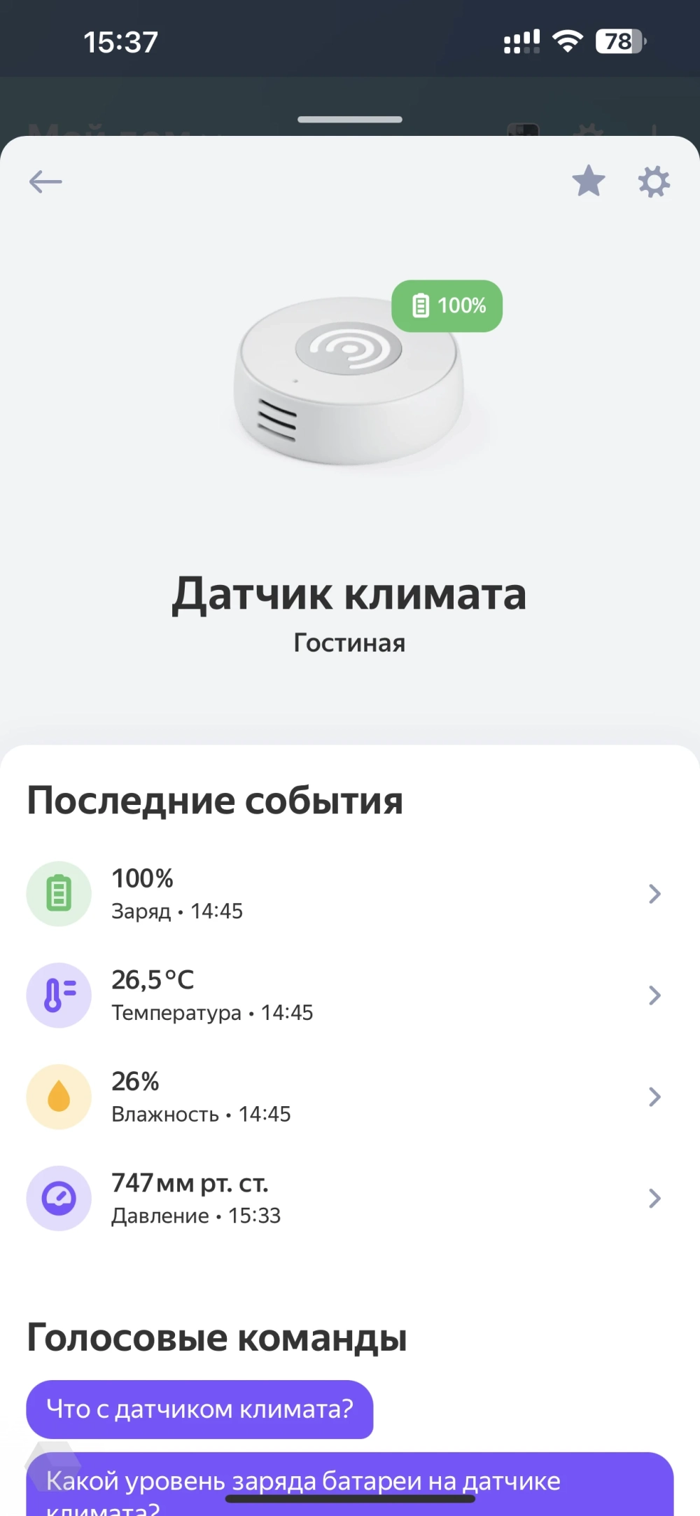 Можно спросить у «Алисы» температуру, влажность и атмосферное давление. Можно даже за окно его прилепить и измерять температуру на улице, но влагозащиты нет, поэтому я бы не стал.