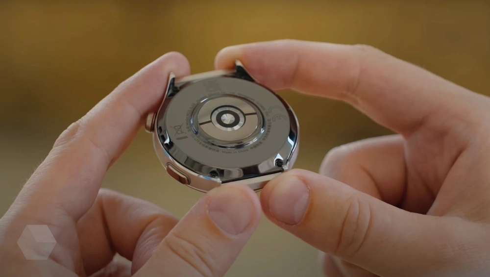Для навигации по системе в Huawei Watch 4 Pro используются сенсорный экран, кнопка-крутилка сбоку и большая физическая кнопка. На тыльной части датчики и коннектор зарядки. Всё привычно. Задник часов защищён керамикой.