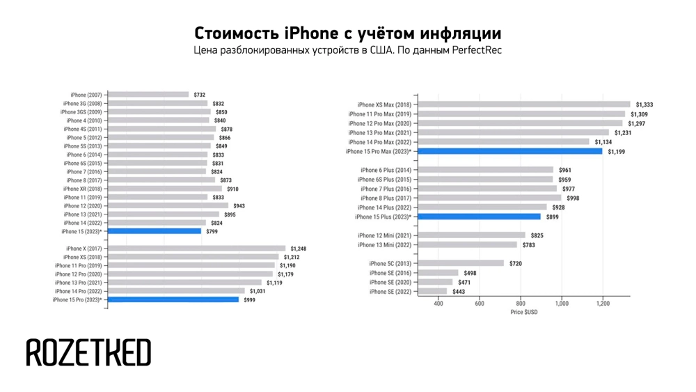 Но если хоть чуть-чуть побыть оптимистом, можно сказать, что это самый дешёвый iPhone за последнее время. Звучит странно, но слово «инфляция» всё проясняет. И если посмотреть на все iPhone с учётом этой инфляции, то 15-я серия вышла самой дешёвой. Дешевле только самый первый iPhone.