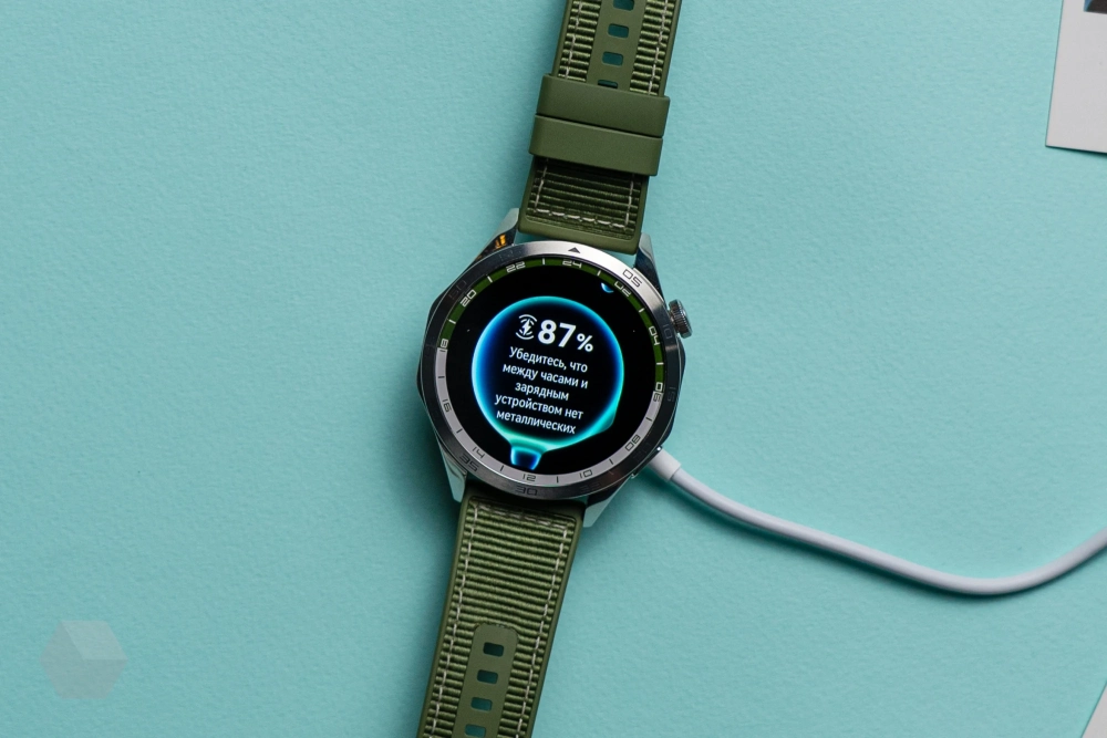 Последний представляет собой круглый плоский кредл с USB-шнуром длиной около 80 см. В отличие от многих других подобных устройств, здесь никаких внешних контактов нет, зарядка у Watch GT 4 беспроводная, что, как ни крути, несомненный плюс.