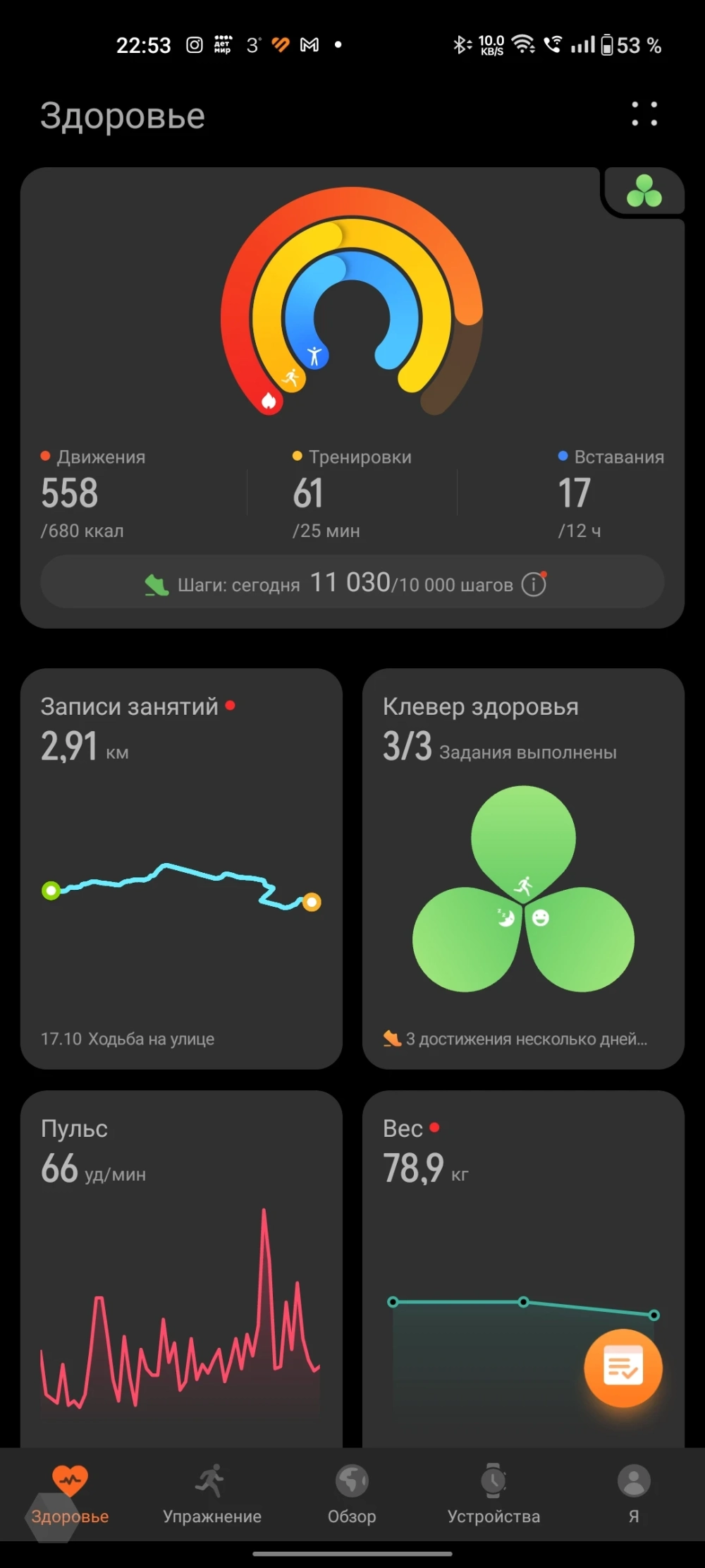 Основное взаимодействие с часами происходит через Huawei Health. Оно имеет пять вкладок. В самой левой из них расположены плитки с показателями здоровья и достижениями пользователя, например, кольца активности, графики пульса, веса, сна, стресса и прочие