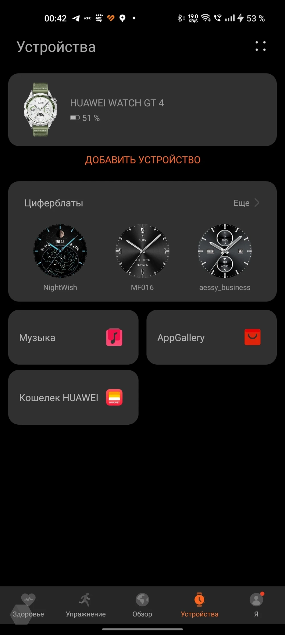 Следующая вкладка отображает подключенные устройства. Именно отсюда можно загрузить новую музыку, циферблат или какое-либо приложение прямо на часы. Кроме того, есть возможность добавить карту для оплаты с помощью носимого устройства.