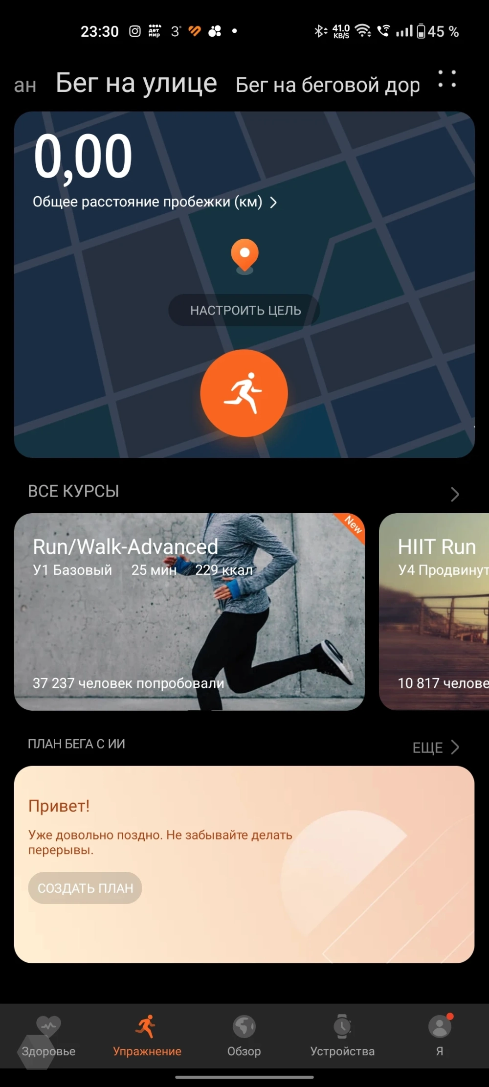 Правее находится вкладка с различными вариантами выбора тренировок. Также доступны для них различные программы для физического развития.