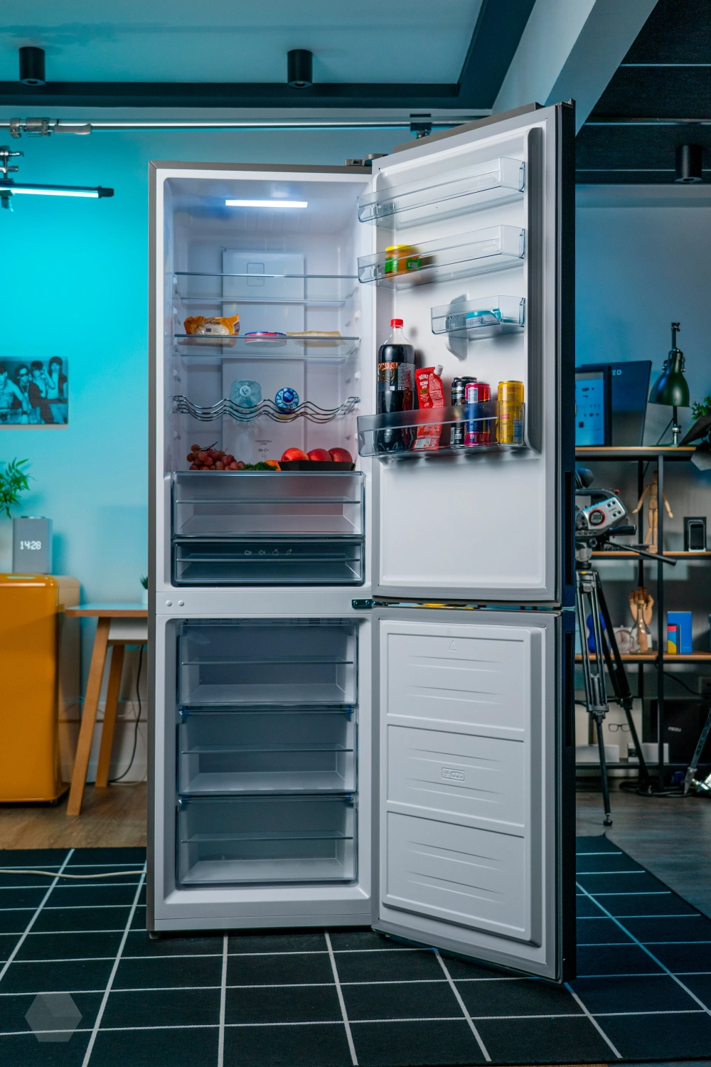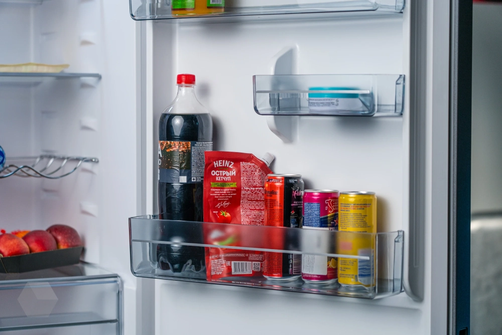 В этой модели общий полезный объём составляет 342 л, из которых 245 л приходится на холодильную камеру, а оставшиеся 97 л на морозилку. Каждая из них управляется отдельно с помощью сенсорной панели на верхней дверце. К ней мы ещё вернёмся чуть позже.