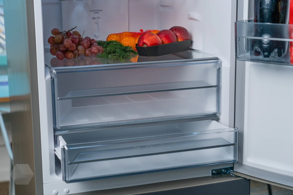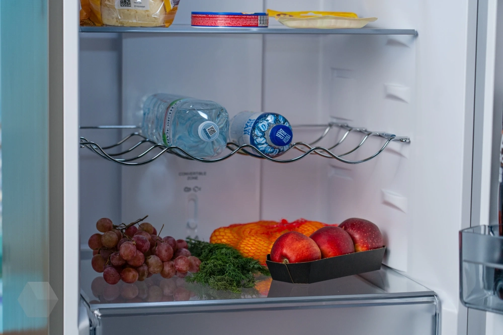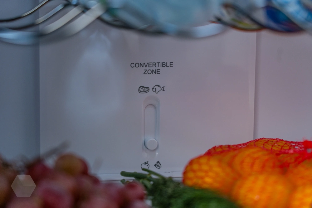 Чуть ниже него находится Convertible Zone или так называемая зона свежести. Это специальный отсек, температуру в котором с помощью специального переключателя можно регулировать отдельно от остального объёма холодильной камеры. Там можно выставить температуру от -3°C до +5°C и хранить мясо, рыбу, морепродукты или овощи с фруктами.